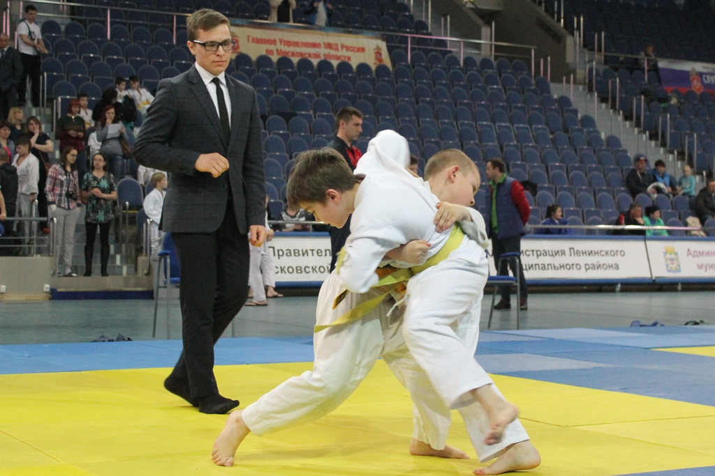 По окончанию торжественной части на татами дворца спорта показали свои навыки и умения полицейские спецкурса Центра профессионально подготовки ГУ МВД России по Московской области (г. Видное-2) имени Героя России майора милиции В.А. Тинькова, под руководством начальника Цикла СПДСП майора полиции Смирнова Андрея Ивановича.