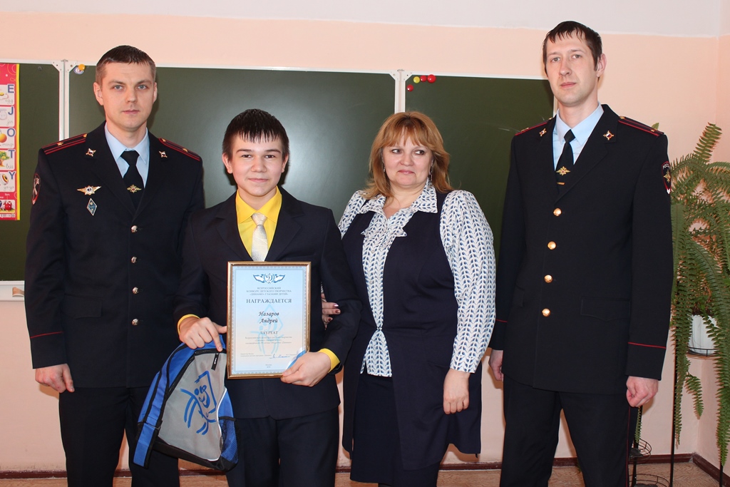 При всех учениках класса, где учится Андрей Назаров, полицейские поблагодарили его за участие в творческом конкурсе, пожелали успехов в учебе и спорте, а также новых побед и достижений.