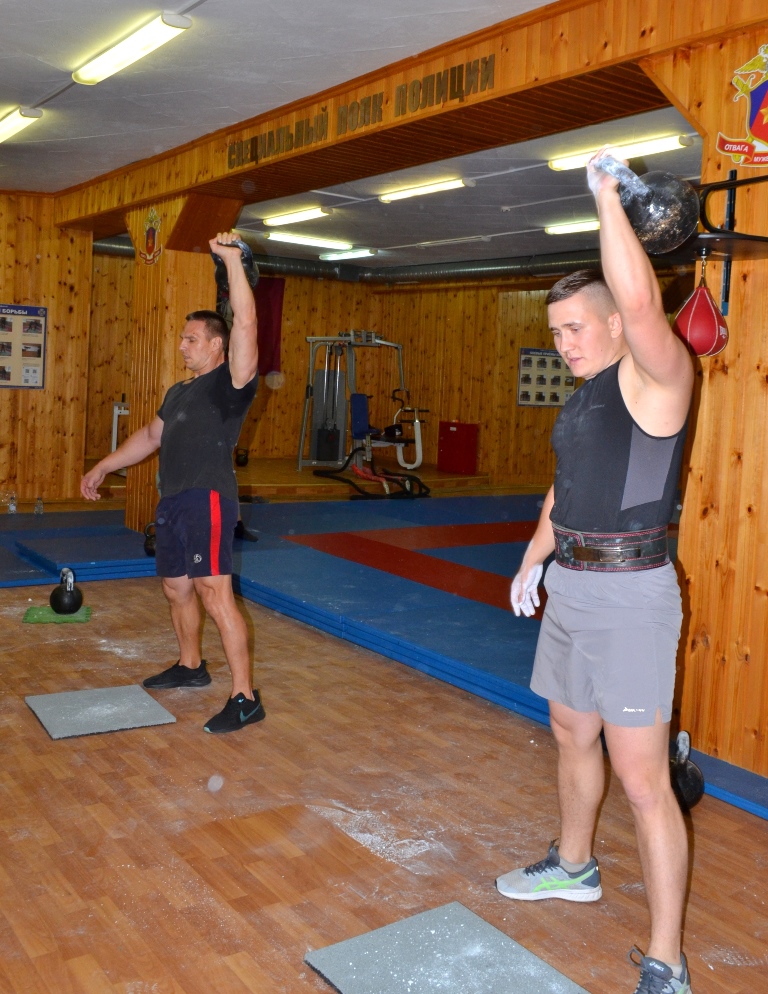 Сильнейшие атлеты Специального полка полиции соревновались в упражнениях «Толчок двух гирь» и «Рывок гири» с весом снаряда 24 кг.